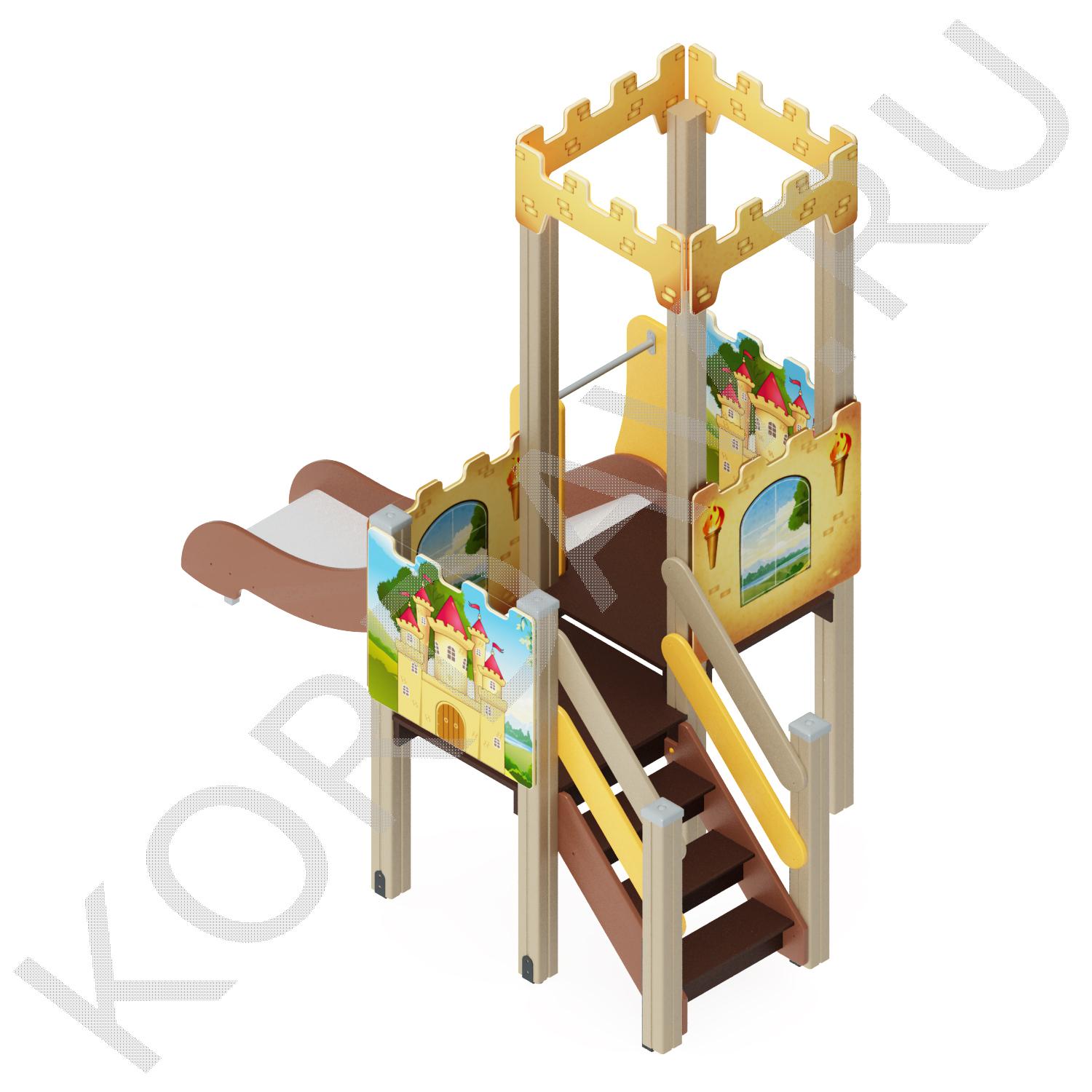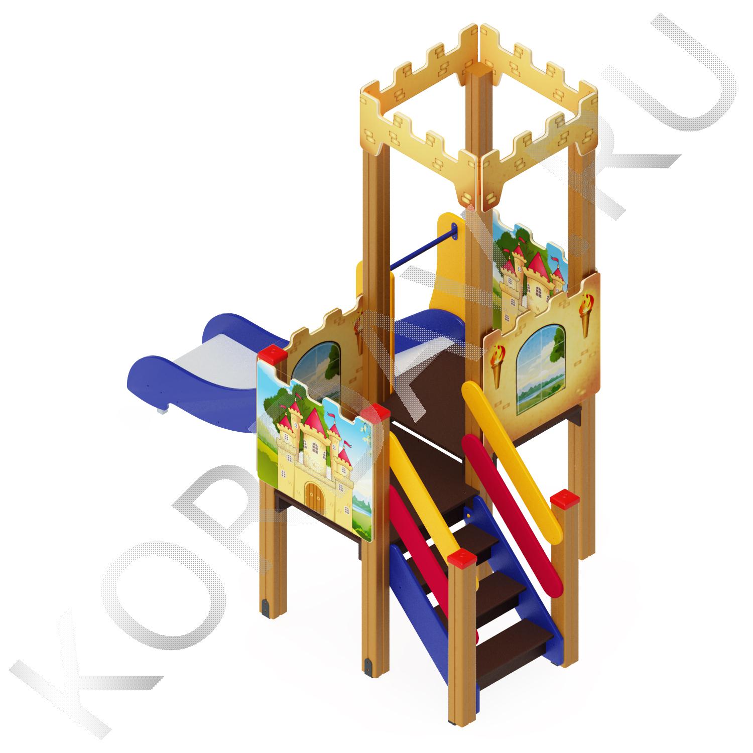 Детский спортивно-игровой комплекс включает в себя горку-башенку и лестницу. Комплекс очень компактный может разместиться даже на не большом участке.